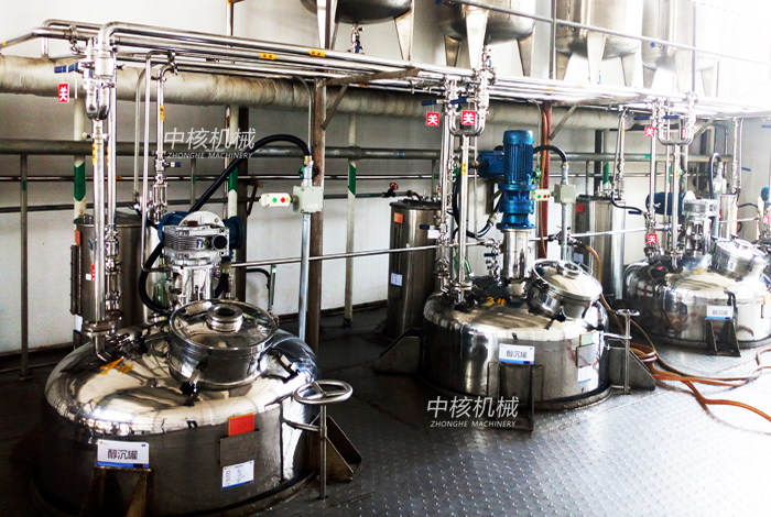 中藥水煎濃縮液(一般比重為1.2左右),去除非醇溶性的淀粉、蛋白質(zhì)等,采用加入酒精配成一定醇度的液體,然后常溫最好是低溫冷凍沉降進(jìn)行固液分離以提高中藥提取液的純度及澄明度,從而提高產(chǎn)品質(zhì)量。濃縮液和酒精按工藝要求,投入各自的配比量并開啟冷凍鹽水或冷卻水,攪拌混和均勻,達(dá)到料液所需的溫度后停止攪拌,繼續(xù)在夾套內(nèi)通入冷凍鹽水或冷卻水,保證所需的液溫。待沉淀完成后開啟上清液出料閥放料。