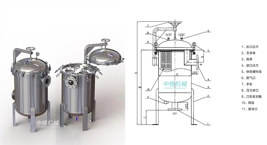 袋式過濾器是一種結(jié)構(gòu)新穎、體積小、操作簡便靈活、節(jié)能、密閉工作的多用途過濾設(shè)備。袋式過濾器是一種壓力式過濾裝置,主要由過濾筒體、過濾筒蓋、快開機構(gòu)、不銹鋼濾籃等部件組成。過濾機內(nèi)部由金屬網(wǎng)籃支撐濾袋,液體由過濾器外殼的旁側(cè)入口流進濾袋,經(jīng)濾袋過濾后從出口流出,雜質(zhì)被攔截在濾袋中。該機更換濾袋十分方便,過濾基本無物料消耗。